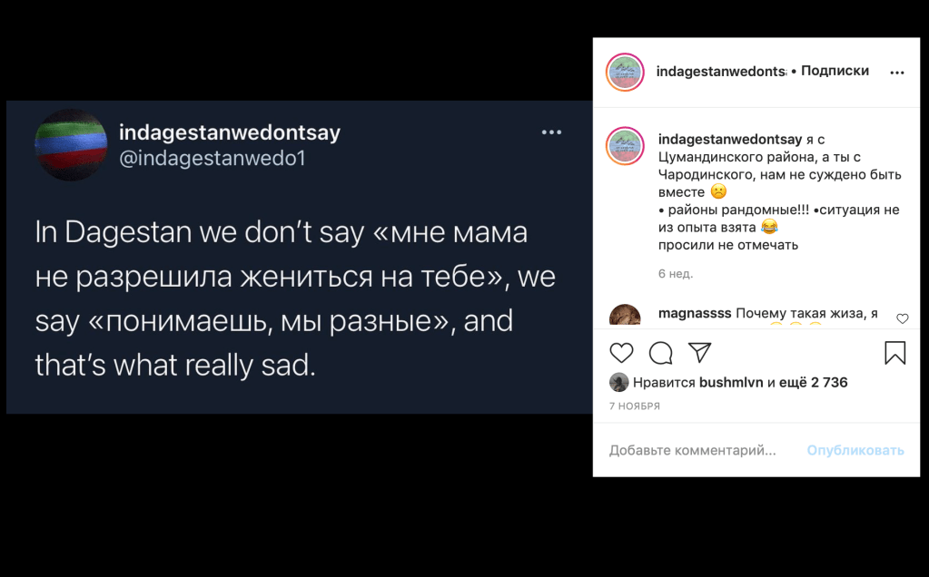 — У меня очень много друзей и подружек-ингушек. Они выкладывали разные приколы типа in Ingushetia we don’t say, in Chechnya we don’t say, и я думала: интересно про Дагестан есть такое? Однажды копалась во всяких этих [пабликах] — In Ukraine we don’t say и так далее, и так это было смешно, что я, загуглив и не найдя такой группы про Дагестан, 3 ноября создала твиттер @asindagestan, следом инстраграм @indagestanwedontsay. Потом зашла в личный профиль, чтобы найти свою группу и подписаться, и тут в поиске нахожу похожую, созданную раньше. Мне стало стыдно. Я спросила у знакомых, стоит продолжать эту идею или нет, и мне сказали: Ты же ее не украла, она везде гуляет по интернету.