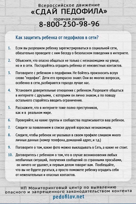 «Мы занимаемся исключительно борьбой с педофилами. К нам часто обращаются дети, у которых такие строгие родители, что им проще отправлять интимные снимки педофилу, чем прийти к маме и все рассказать», – говорит Анна Левченко, руководитель некоммерческого партнерства «Мониторинговый центр по выявлению опасного и запрещенного законодательством контента». Но как выявлять педофилов? Как защитить детей? Что делать, если с ребёнком случилось страшное? На все эти вопросы здесь ответят, подскажут, помогут.