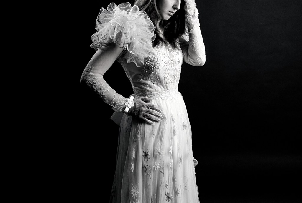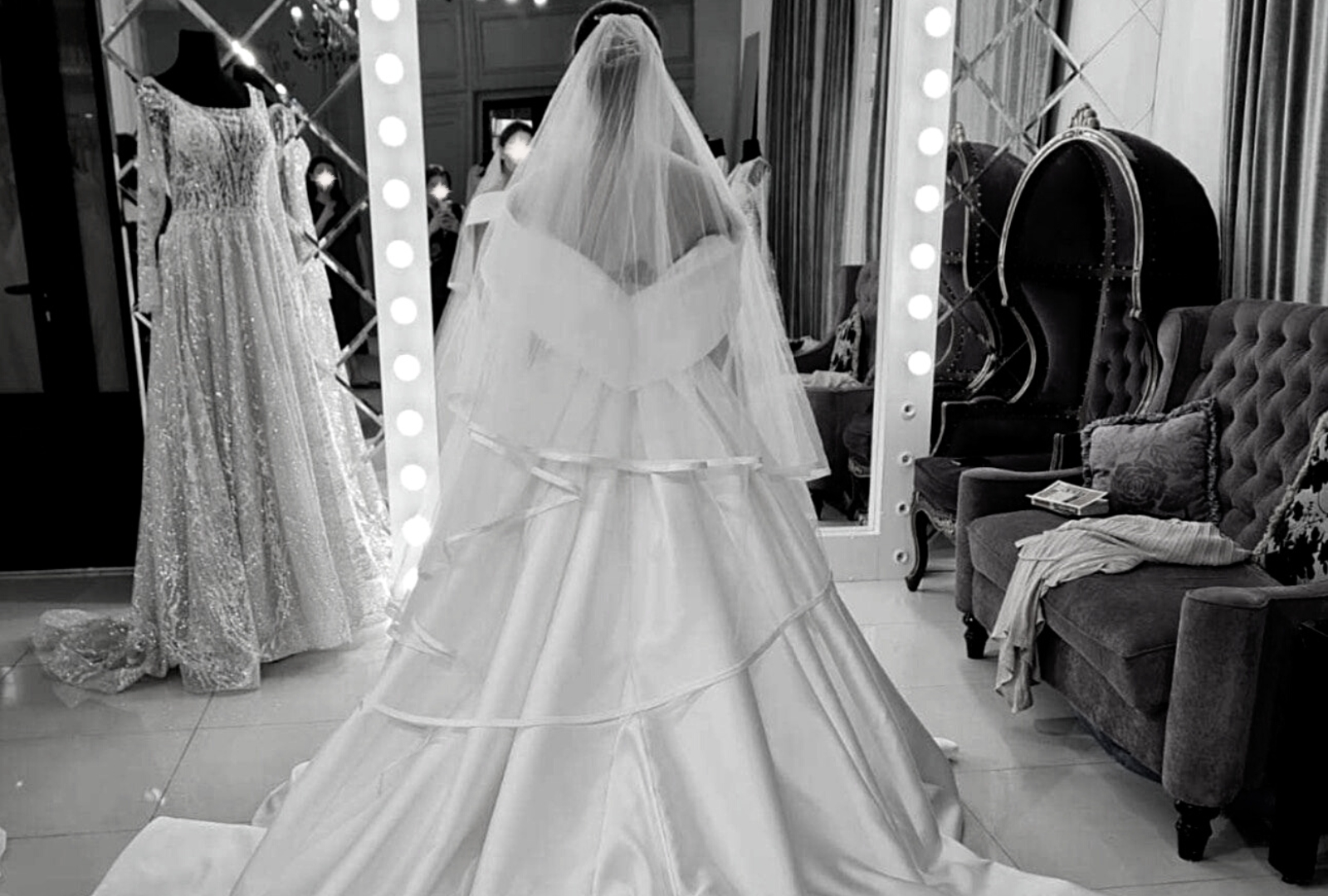 Свадебный салон в Махачкале. Бархатные диваны и кресла, яркие лампы, большое зеркало, в котором отражается Камилла. Она безучастно смотрит в пол, руки безвольно вытянуты вдоль тела. На ней длинное белое платье с пышной юбкой и шлейфом, на голове длинная фата, спускающаяся до пола. В таком платье нельзя и шага ступить без посторонней помощи.