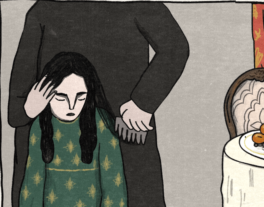 Несмотря на то, что материал тяжелый, для меня он стал очень жизнеутверждающим, и поэтому работа шла удивительно легко. Очень быстро представились визуальные метафоры, сложилась стилистика. Я гуляла по гугл-картам и смотрела, как выглядят улицы и рынки в Дагестане. Иногда возникали конфузы из-за моего незнания кавказского быта. Так, в эпизоде на вещевом рынке я нарисовала обычные принцессочные платья, которые в моем понимании были «шикарными», что, конечно же, было далеко от реальности. Мне очень помогали референсы, которые присылала Ася, и которые я находила сама, например, интерьеры смотрела на сайтах недвижимости, а одежду – в мусульманских онлайн-магазинах.