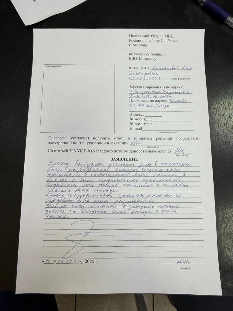 Айна подала заявление с требованием возбудить уголовное дело в отношении родственников, которые, по ее словам, неоднократно применяли к ней насилие, в том числе сексуализированное. Она также обратилась с просьбой о предоставлении государственной защиты.